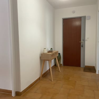Le hall d'entrée doté d'une penderie donne sur une pièce de vie lumineuse et chaleureuse de 35 m² réunissant salon et salle à manger.