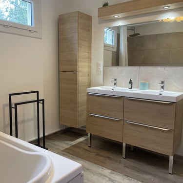 La salle de bain, récemment rénovée, propose un aménagement soigné avec double vasque, baignoire, nombreux rangements et sèche-serviettes.
